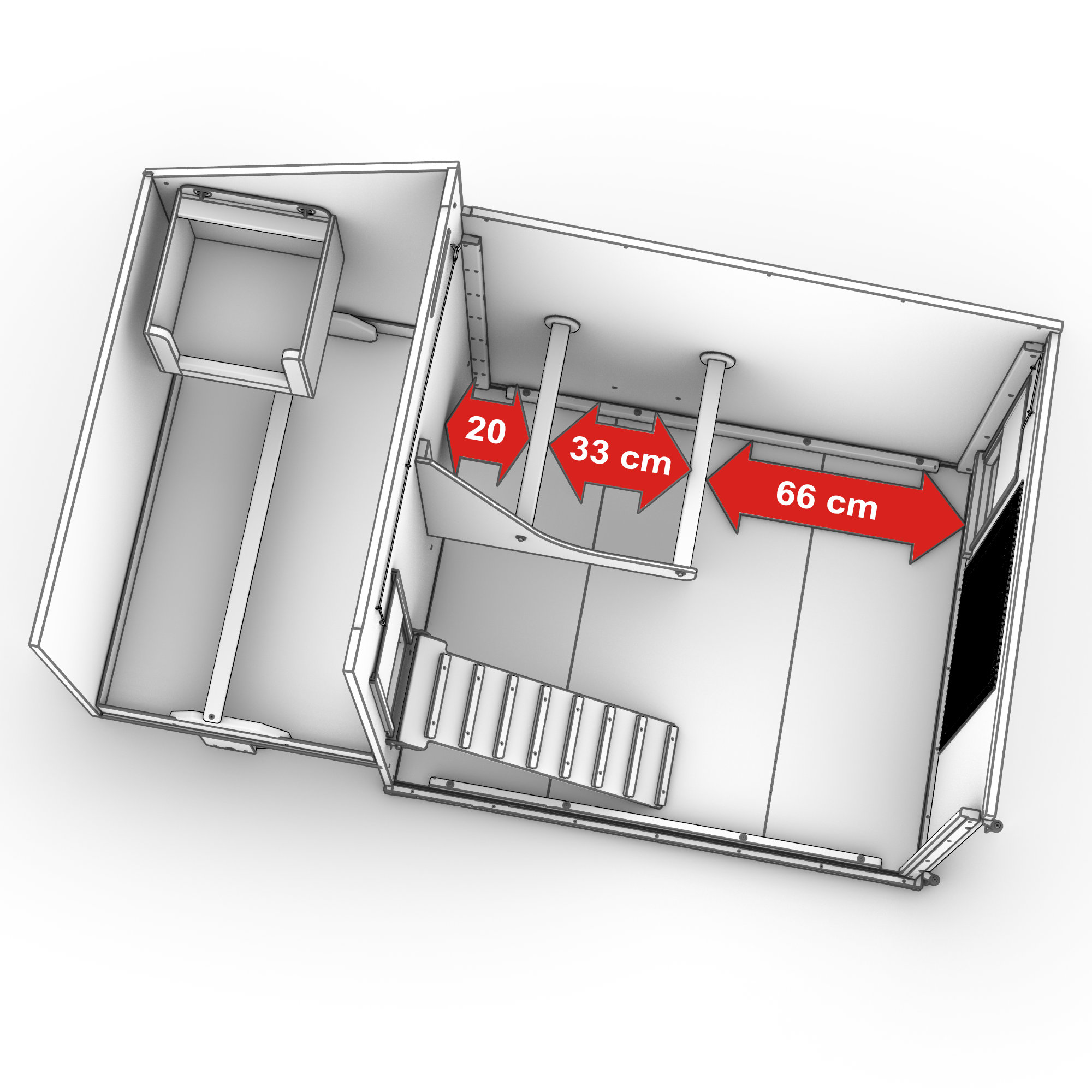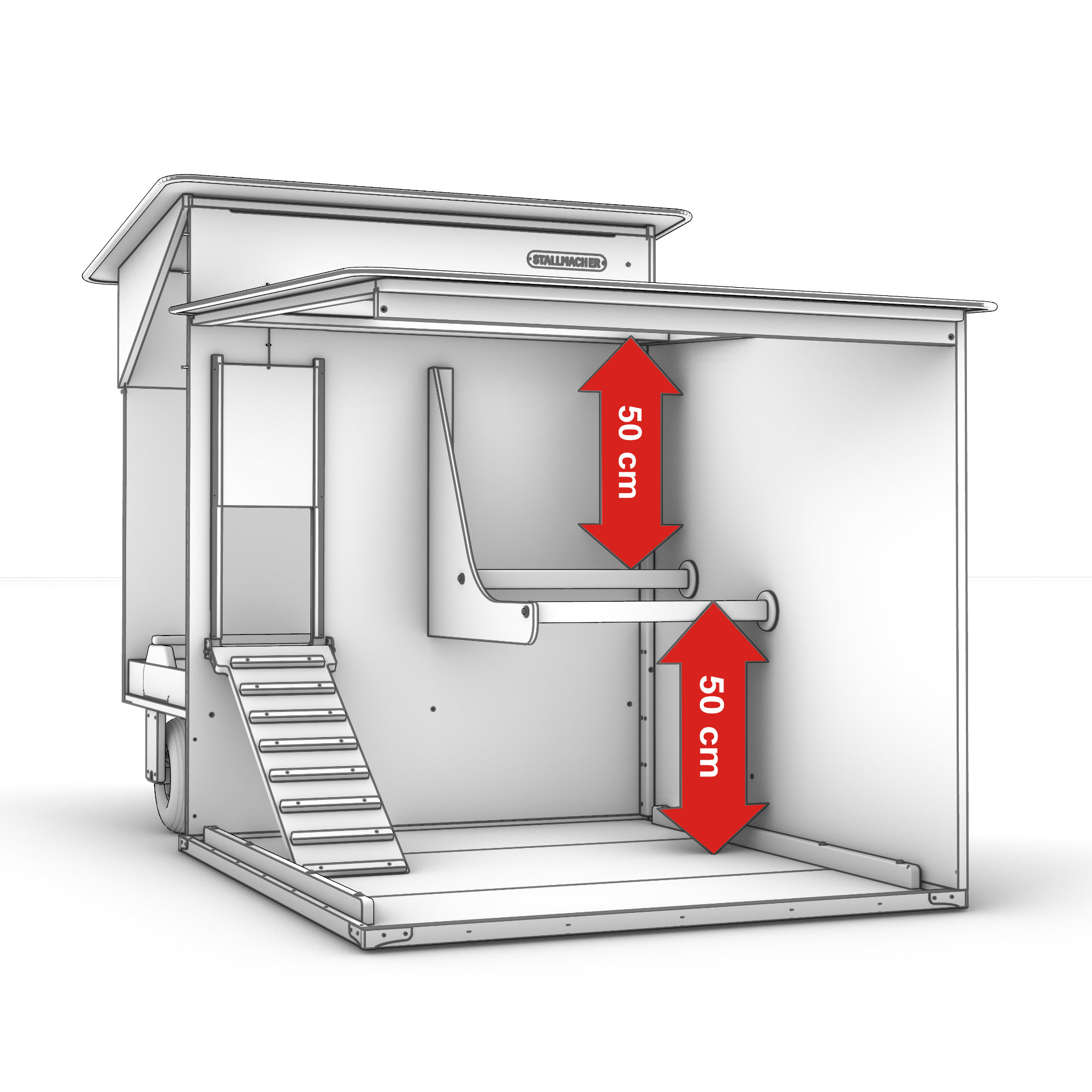 - Herausnehmbarer Innenausbau mit Unterschlupfhäuschen, Ruhebrett und Heuraufe