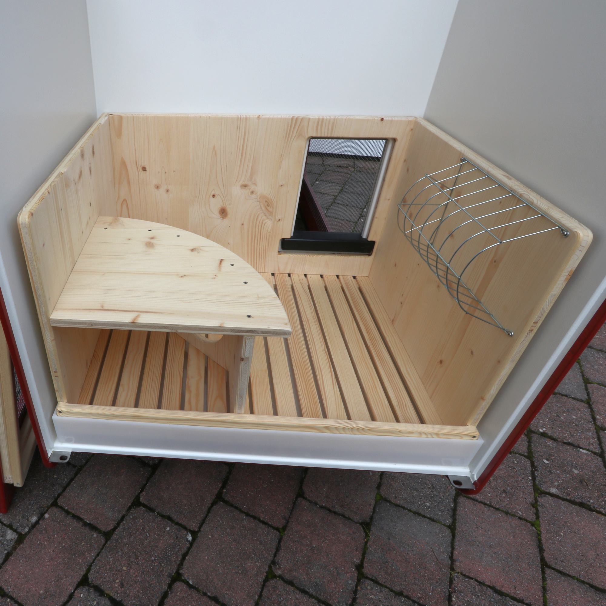 Nach gut 10 Jahren hat unser Kaninchenstall-Konzept in der Kabine ein Redesign erhalten. Der Grund: Unsere beiden Holländer-Damen pinkeln mit Wonne in der Kabine gegen die Wand und so läuft der Urin beim alten Konzept leider zum Teil neben die Kotwanne. Bei der Gelegenheit haben wir gleich die aktuellen Tierwohl-Vorgaben für Kaninchen berücksichtigt. Der Innenwand-Einsatz aus unbehandeltem Holz ist nun komplett mit Ruhebrett, Heuraufe und Unterschlupf-Häuschen ausgestattet.