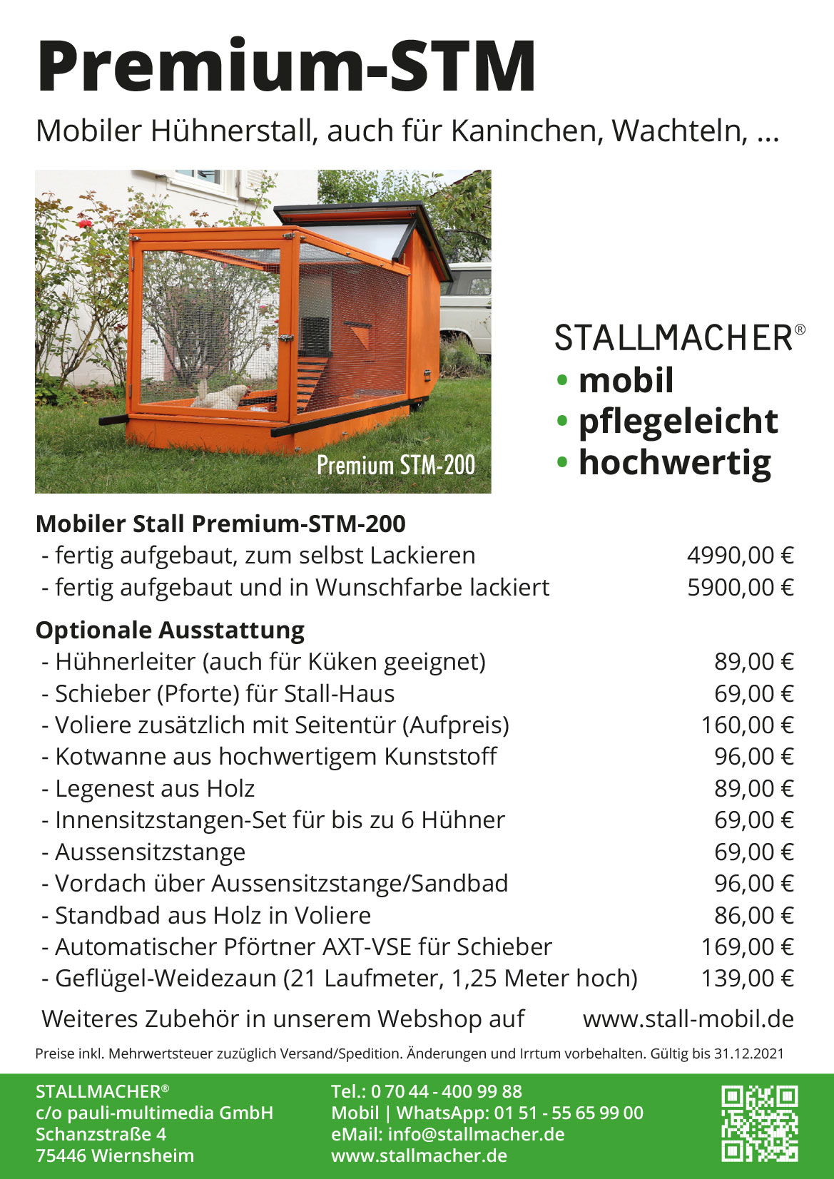 Unser Webshop wird derzeit gefüllt. Sobald der Premium-Stall vollständig eingestellt ist, können Sie natürlich Ihren Hühnerstall für bis zu 6 Hühner auch gerne unter stallmacher.com online bestellen.