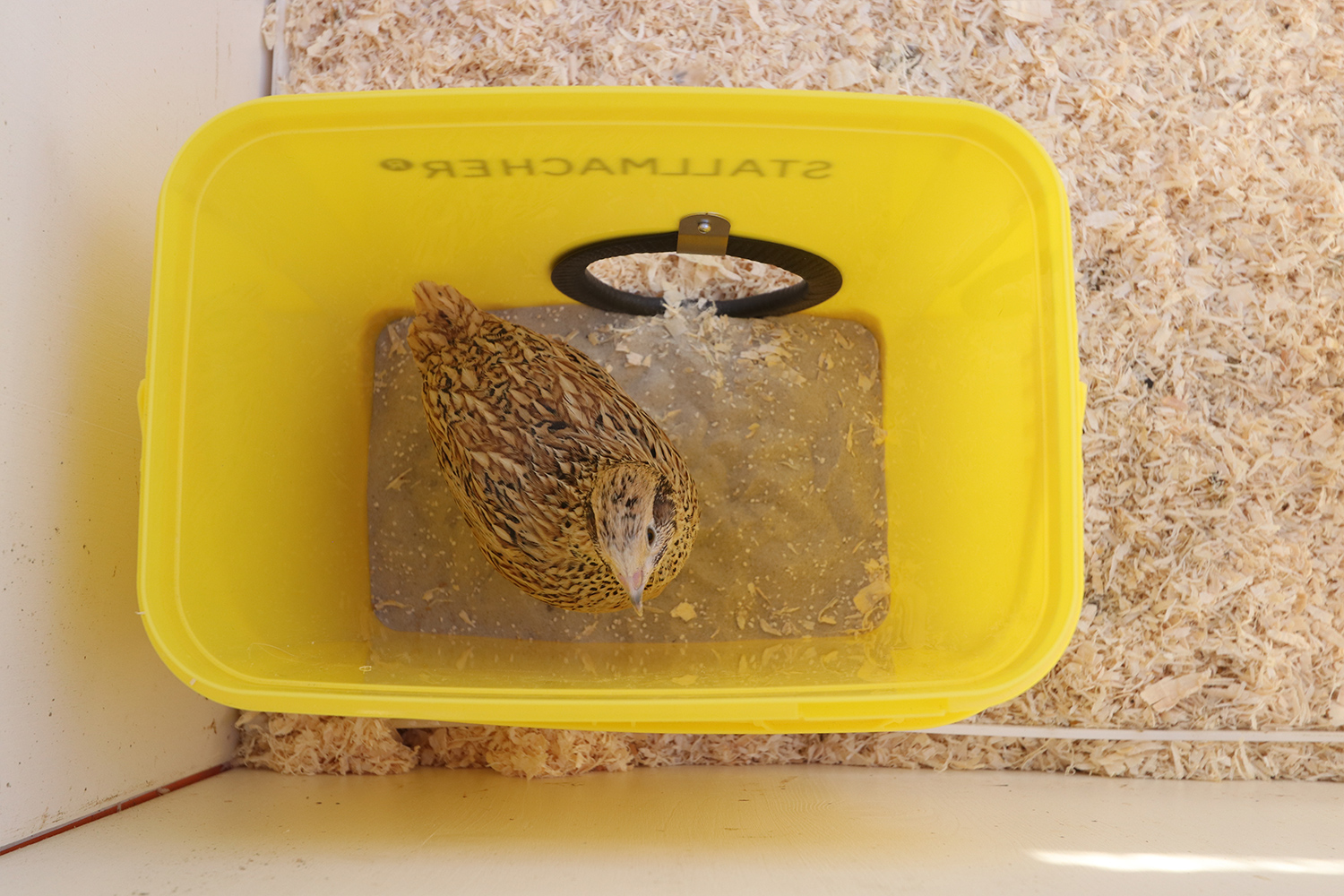 - Locken Sie die Wachteln mit Leckerli oder setzen Sie alle Tiere in das Stallhaus