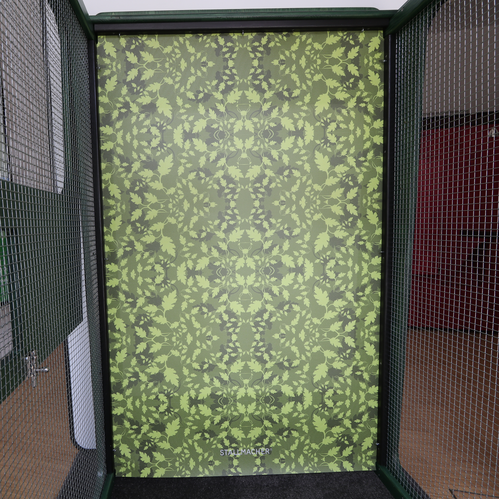 - Der Camouflage-Himmel wird mit 5 cm Abstand zum Regendach montiert. Ein etwaiger Aufprall wird so durch das weiche Meshgewebe abgefedert.